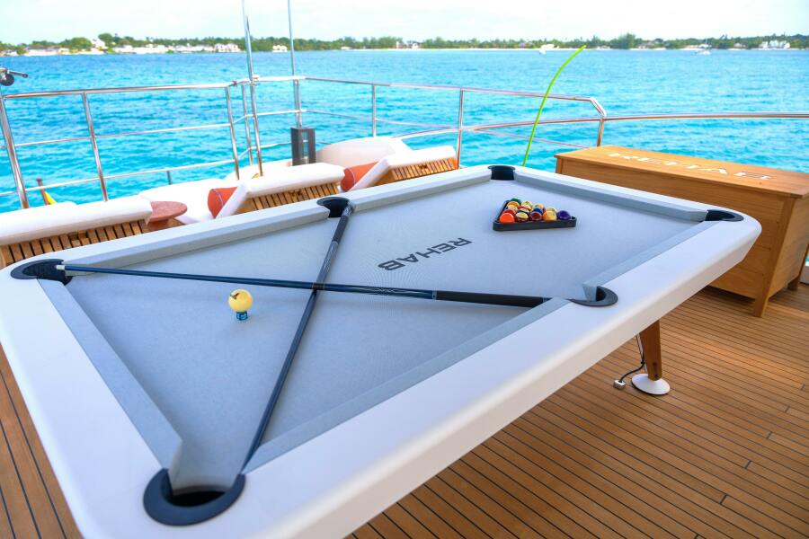 5. Redesigned sun deck layout includes jacuzzi, bar, pool table, sun loungers, and diving board.