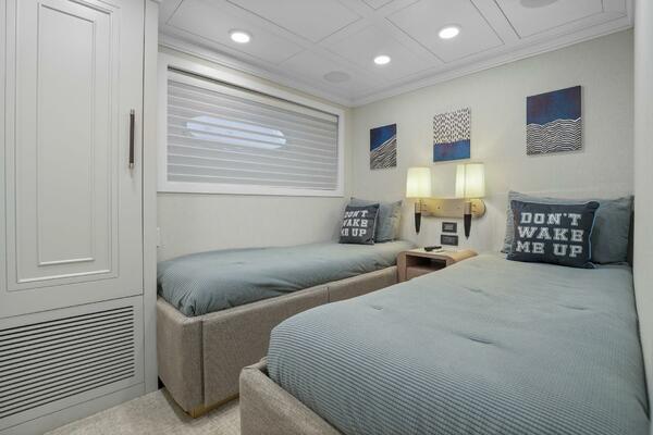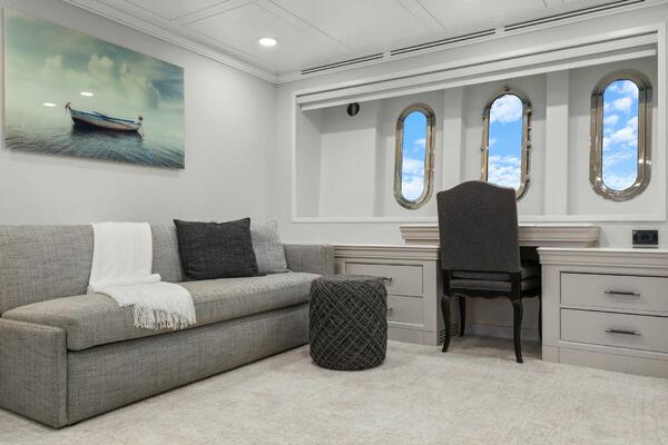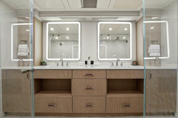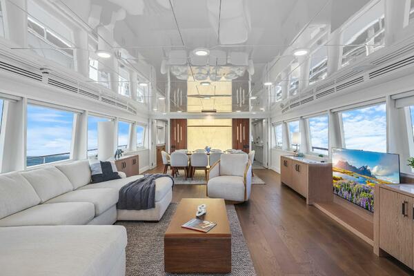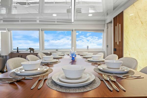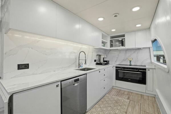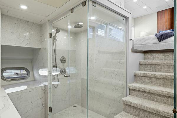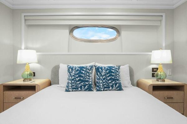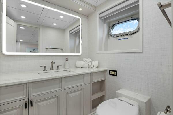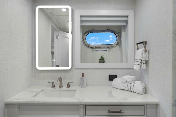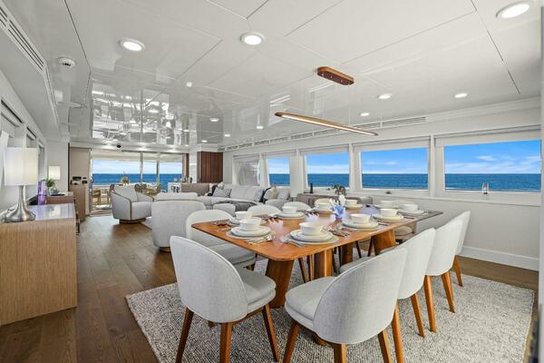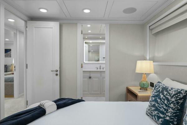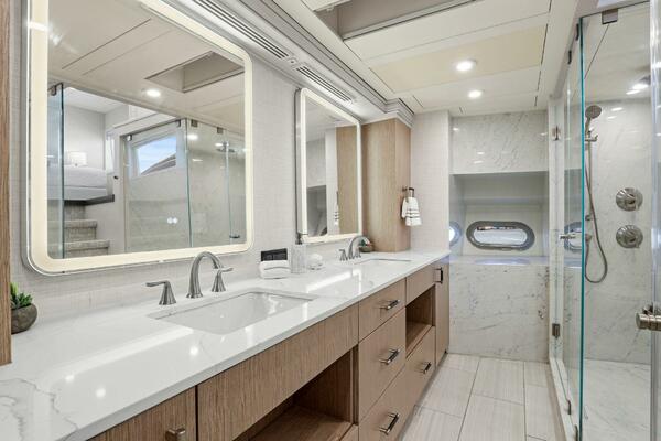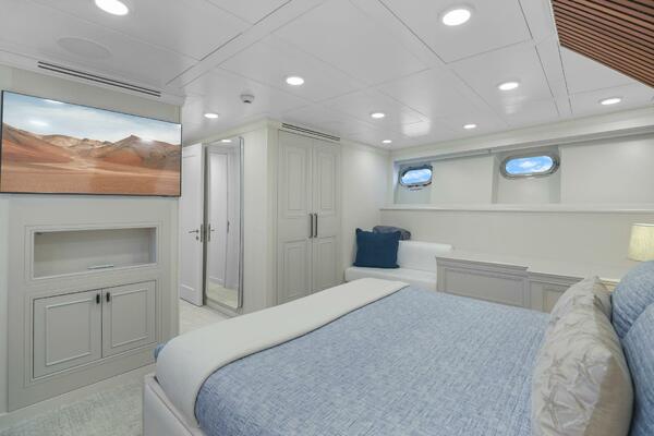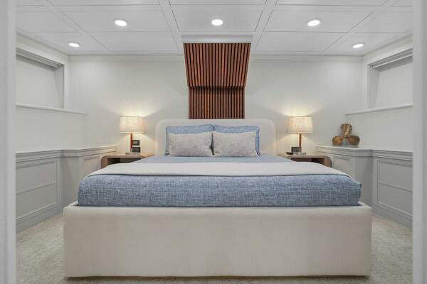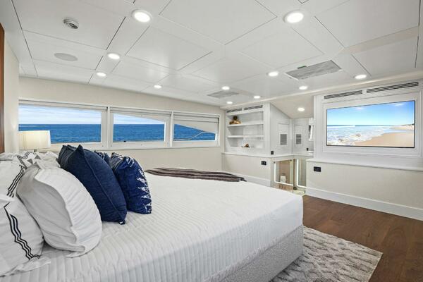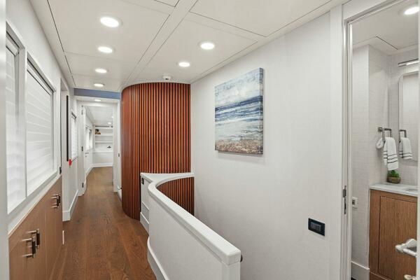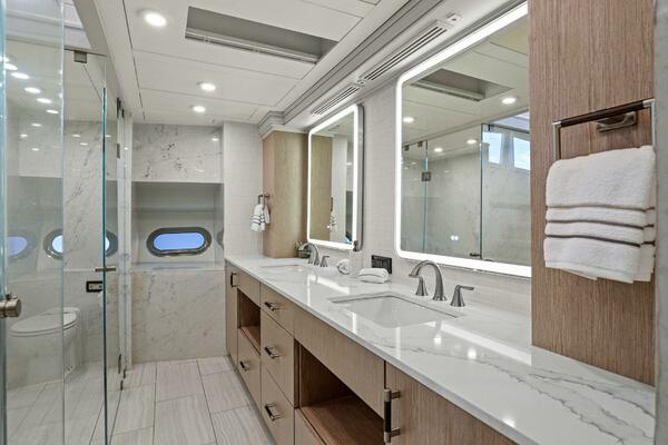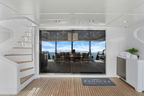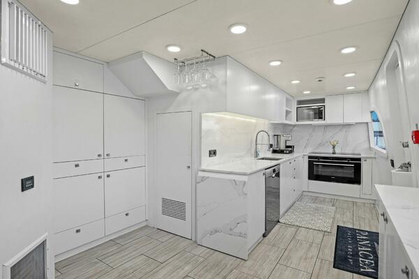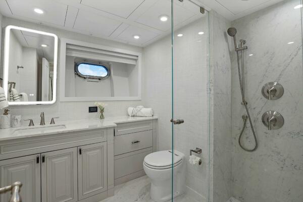 The refit just completed on PANACEA is noting short of amazing. Everything on the interior has been touched from every piece of interior wood & cabinetry, flooring, wall coverings, LED lighting retrofit, quartz counters in heads & galley, custom SkinRock Carrara marble in heads, fixtures, updated AV, AC system serviced, custom furniture, and the list goes on. Oh and that's just for the interior. The exterior also just received a huge upgrade with all new soft goods, deck furniture, rebuilt hot tub, refreshed teak & caulking, and also a complete paint job by Luu at LMC in 2022. The engine room also just received a makeover with complete services including heat exchangers and aftercoolers to the Cat C32 mains, generators and transmissions. The engine room floor and entry way was also freshly powdercoated.